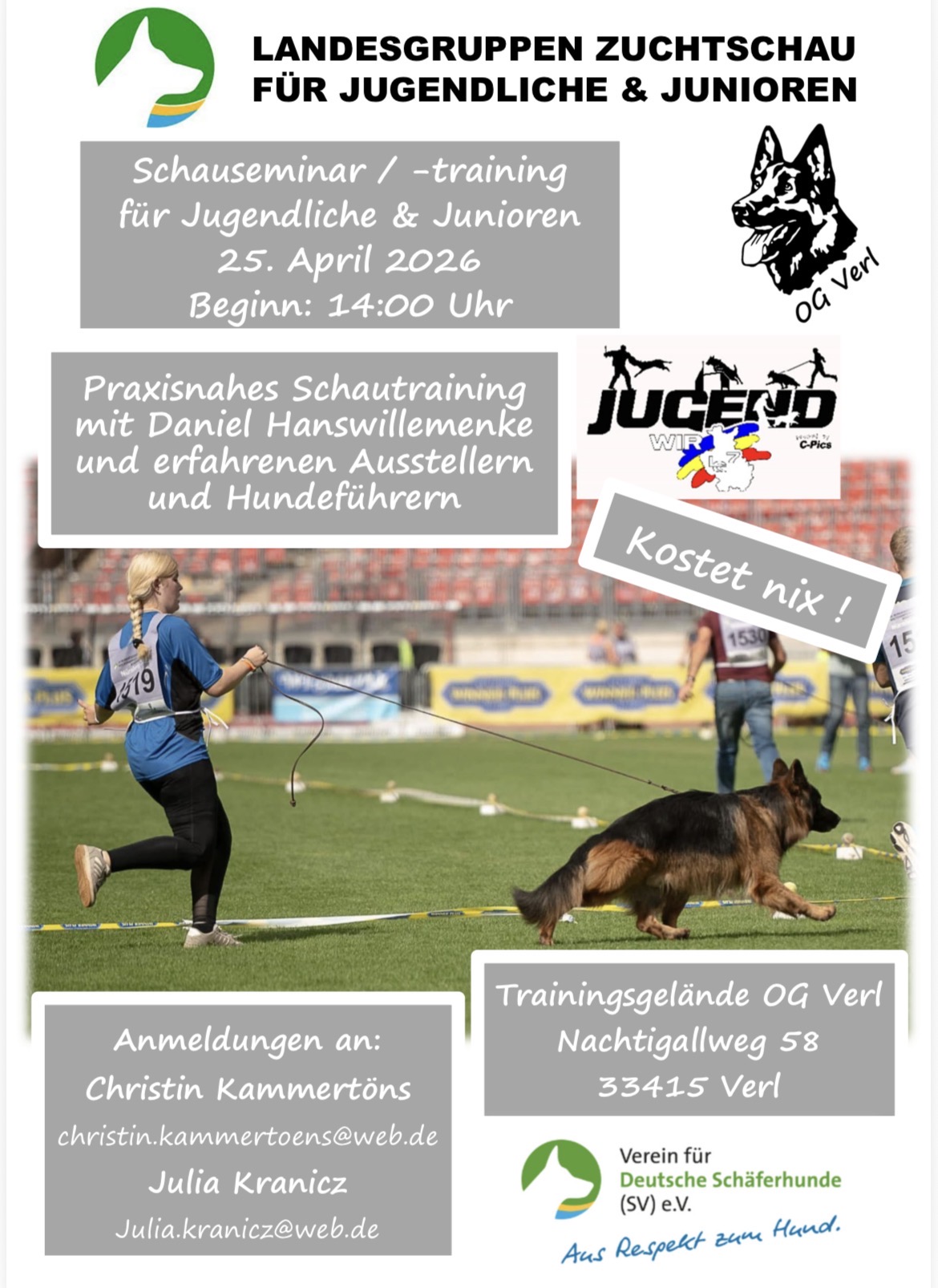 Für die Körung am 2.5.26 gibt es folgende Trainingstermine mit dem Körhelfer Jens Lauströer Dienstag 21.4. ab 17 Uhr und Dienstag 28.4. ab 17 Uhr